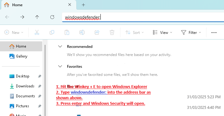 • Want to open Windows Security directly from File Explorer? Type this in the address bar: windowsdefender: